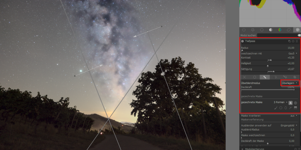 Im nächsten Schritt versuchen wir weiter die Farben der Milchstraße herauszuarbeiten und bedienen uns des Tiefpass-Moduls. Auch hier kann die Maske der ersten Kontrast-Equalizer-Instanz wiederverwendet werden.